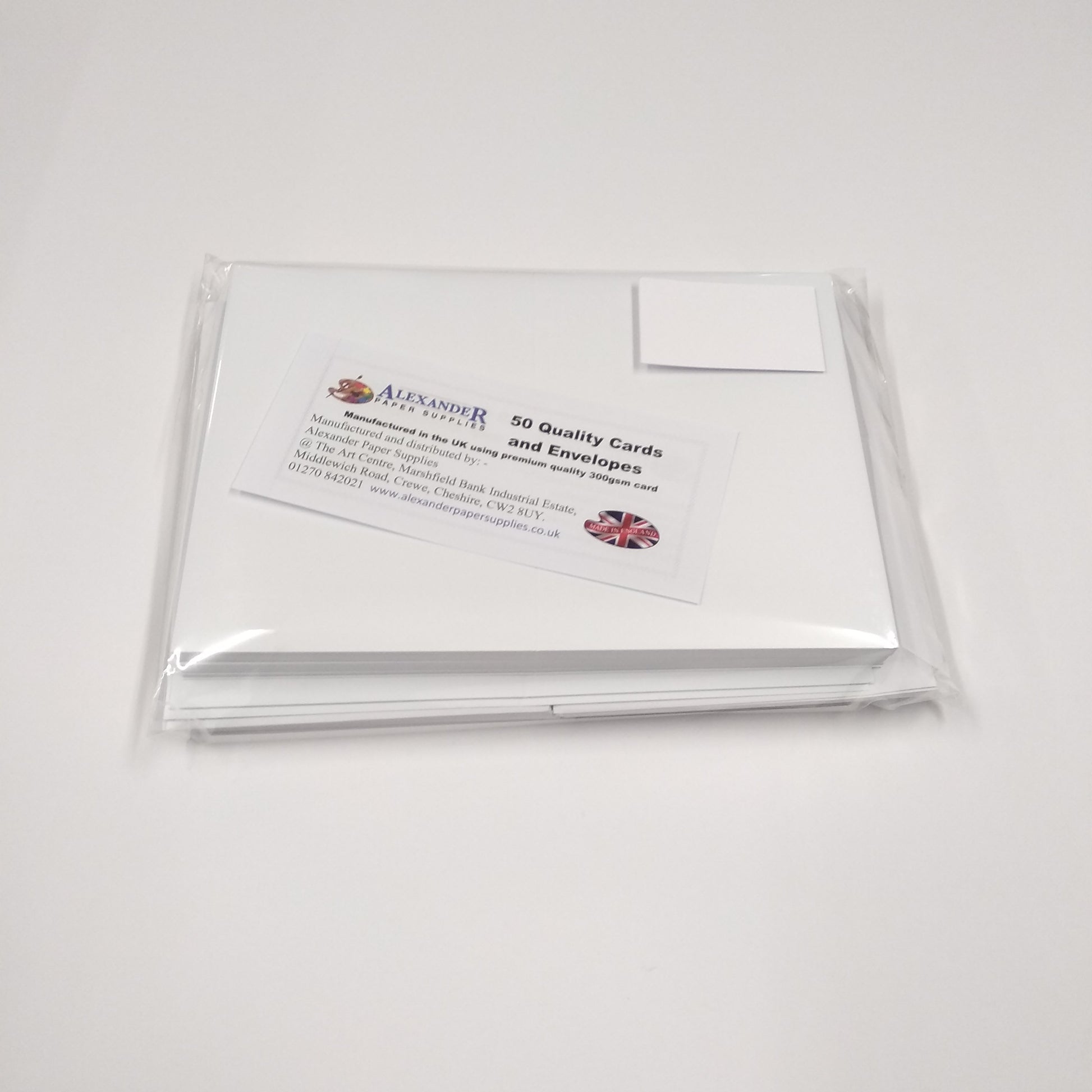 50 x A6 (105mm x 145mm) 300gsm white cards and white envelopes