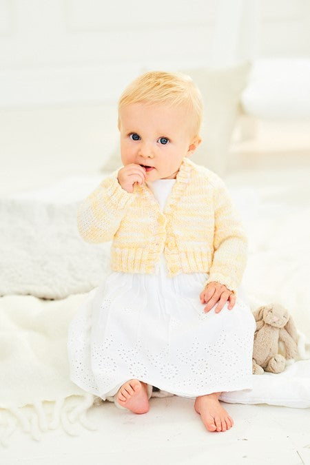 A lovely long and short sleeved cardigan set are featured in pattern 9899. The long sleeved option is knitted in stocking stitch with ribbed edging while the short sleeve option has a contrast colour border to add that little bit of extra detail. Both are V-neck cardigans, just perfect for your little rays of sunshine.