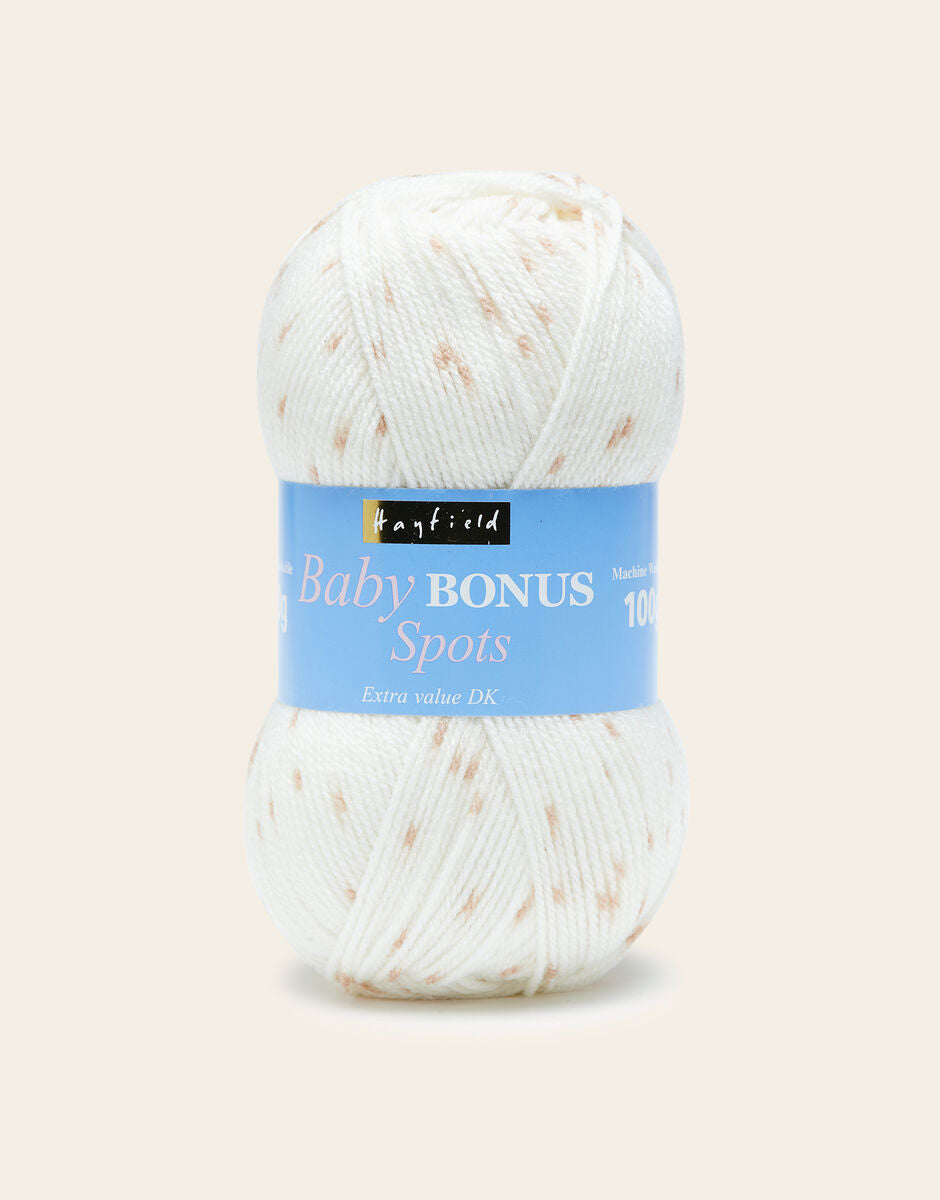 A popular colour effect baby yarn for knitters on a budget. Baby Bonus Spots adds a playful pattern to our Baby Bonus family. In a standard weight, compatible with any standard double knitting pattern, you can add a sprinkle of extra interest to all your favourite double knitting projects for your little ones.