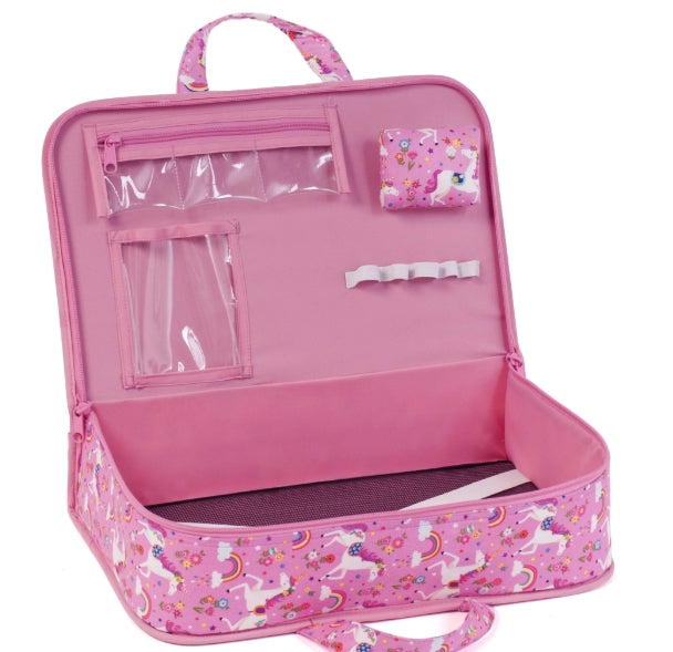 Zippered project case made from cotton fabric. Internal zippered transparent pockets to keep small items secure. Internal elastic loops for holding accessories. Pincushion in lid. Space to store ongoing projects with cross over elastic straps to secure items in place. Spot clean only. Item size: (d/w/h) 24 x 38 x 9.5cm.