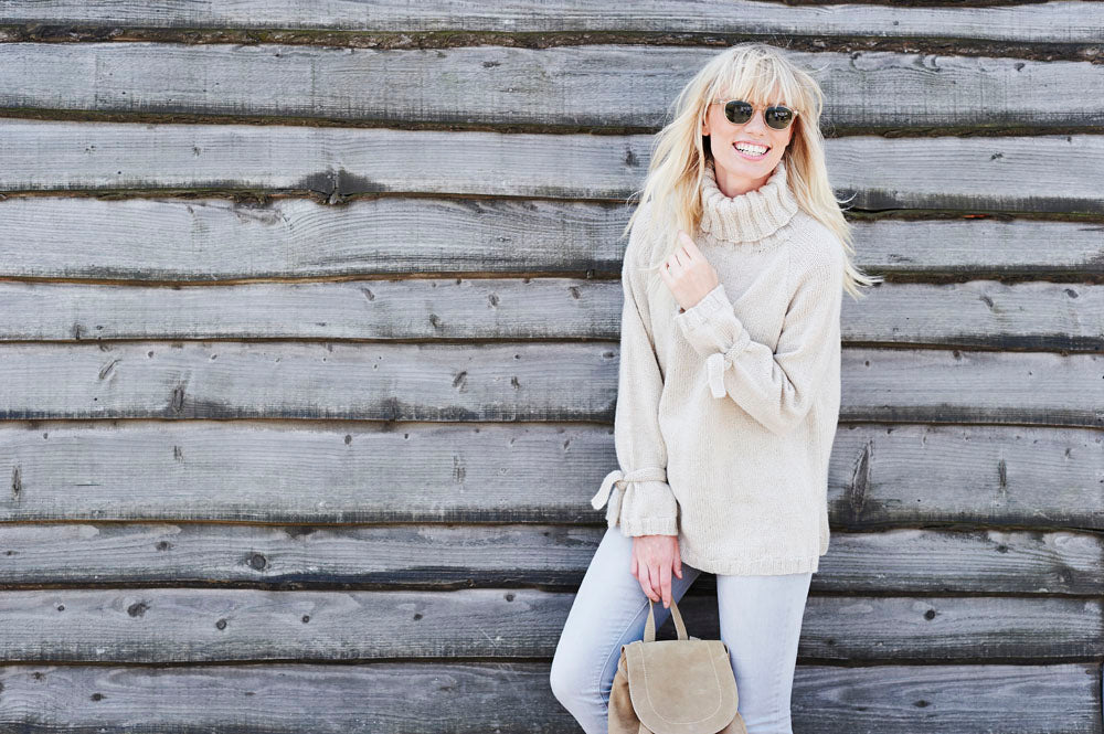 Cowl neck and funnel neck sweaters in easy stocking stitch. Both have side seam slits and optional wrist ties.